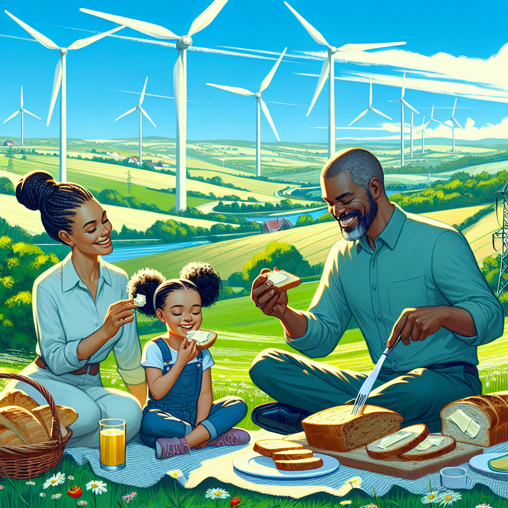 ChatGPT: A picturesque countryside with rolling green hills is dotted with wind turbines generating power under a clear blue sky. In the foreground, a family is enjoying a picnic, spreading creamy butter on slices of freshly baked bread.