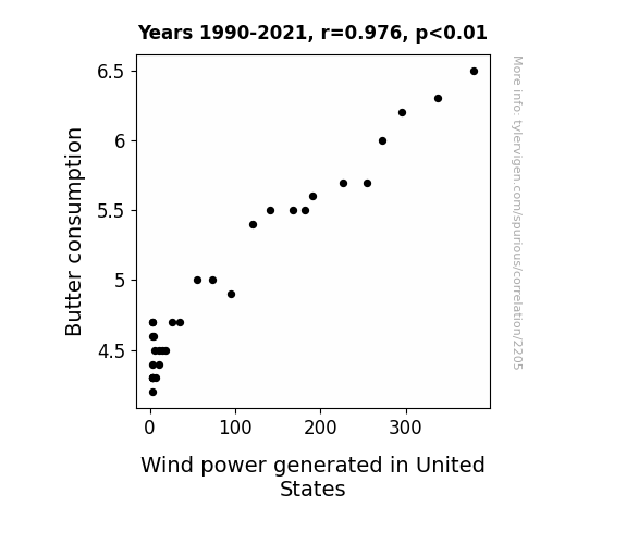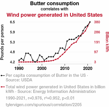 - The spurious research paper: Churning the Winds: Exploring the Correlation between Butter Consumption and Wind Power Generation in the United States