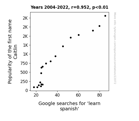 This means 90.6% of the change in the one variable (i.e., Google searches for 'learn spanish') is predictable based on the change in the other (i.e., Popularity of the first name Caitlin) over the 19 years from 2004 through 2022.