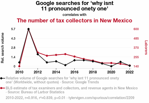 This means 83.9% of the change in the one variable (i.e., The number of tax collectors in New Mexico) is predictable based on the change in the other (i.e., Google searches for 'why isnt 11 pronounced onety one') over the 13 years from 2010 through 2022.