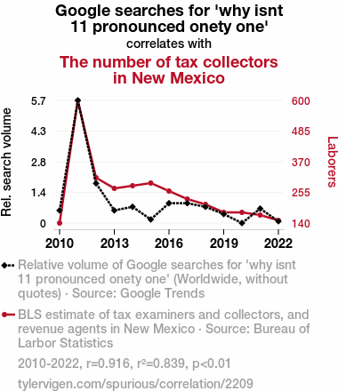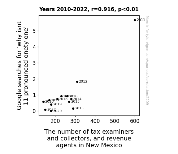 User prompt: Please provide potential search keywords for a paper titled Pondering Onety-One and Tax Fun: A Correlation in New Mexico Unspun with an abstract of This paper explores the fascinating link between the peculiar Google searches for "why isn't 11 pronounced onety one" and the number of tax examiners and collectors, and revenue agents in the scenic state of New Mexico. We delve into the data to unravel this delightful mystery and deliver some tax-tastic findings with a side of dad jokes.