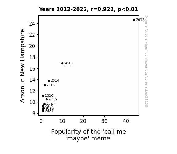 This means 85% of the change in the one variable (i.e., Popularity of the 'call me maybe' meme) is predictable based on the change in the other (i.e., Arson in New Hampshire) over the 11 years from 2012 through 2022.