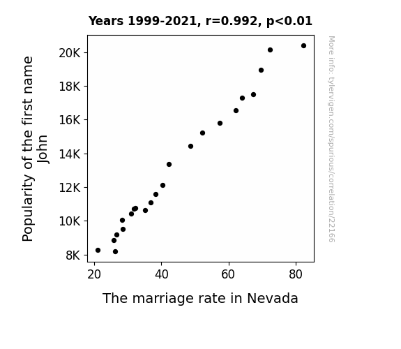 This means 98.4% of the change in the one variable (i.e., The marriage rate in Nevada) is predictable based on the change in the other (i.e., Popularity of the first name John) over the 23 years from 1999 through 2021.