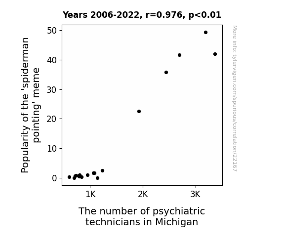This means 95.3% of the change in the one variable (i.e., The number of psychiatric technicians in Michigan) is predictable based on the change in the other (i.e., Popularity of the 'spiderman pointing' meme) over the 17 years from 2006 through 2022.