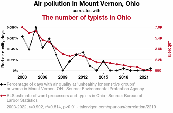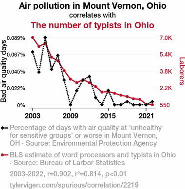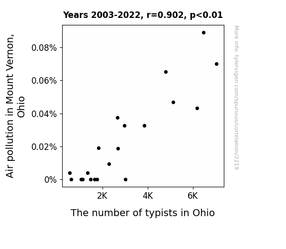 User prompt: Please provide potential search keywords for a paper titled The Mount Vernon Pollution Commotion and Ohio's Typist Promotion: A Correlational Examination with an abstract of This research aims to investigate the intriguing relationship between air pollution in Mount Vernon, Ohio and the number of typists across the state. Utilizing data obtained from the Environmental Protection Agency and the Bureau of Labor Statistics, this study analyzed the period from 2003 to 2022. The findings revealed a remarkably high correlation coefficient of 0.9020436 and a statistically significant p-value of less than 0.01, suggesting a link between the two seemingly unrelated phenomena. The implications of this unexpected connection and its potential impact on the typist population and environmental policies are discussed.
