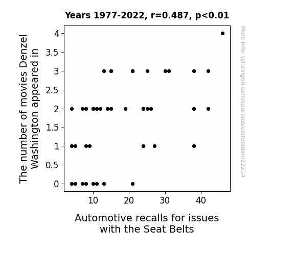 This means 23.7% of the change in the one variable (i.e., Automotive recalls for issues with the Seat Belts) is predictable based on the change in the other (i.e., The number of movies Denzel Washington appeared in) over the 46 years from 1977 through 2022.
