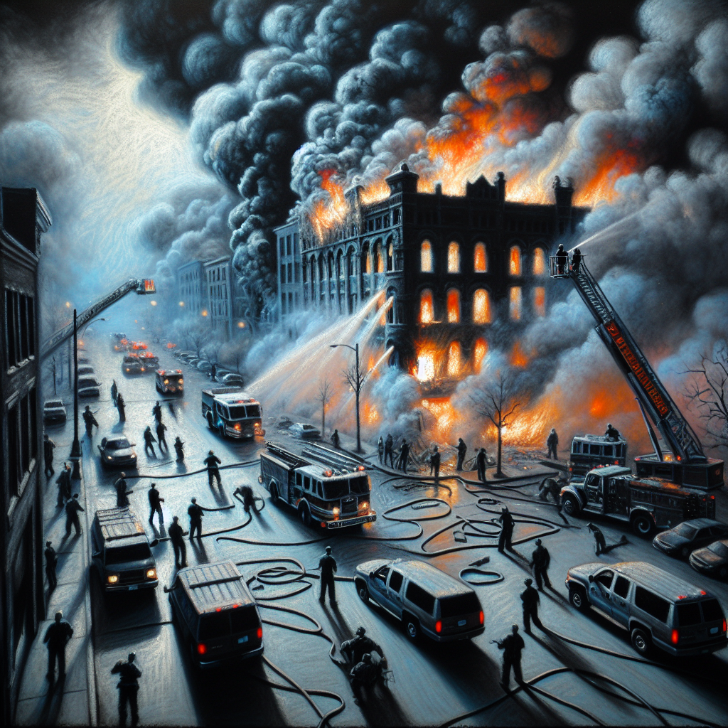 Prompt: Prompt: Generate an image using [ Charcoal ] that illustrates a hazy, smoke-filled cityscape of Des Moines, with a building engulfed in flames as emergency vehicles rush in. The scene should capture the tense atmosphere as firefighters struggle to contain the arson-caused blaze, amidst the murky, smoky air. The focus should be on the contrast between the dark, thick smoke and the bright, fiery flames. The depiction should include only scenes, people, and objects, it should not include text or speech bubbles.