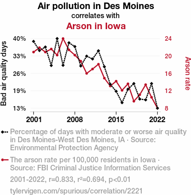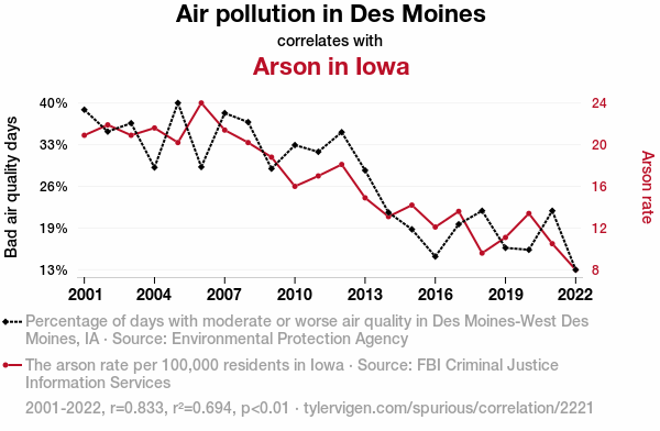 - The spurious research paper: Fanning the Flames: The Smoky Link Between Air Pollution in Des Moines and Arson in Iowa