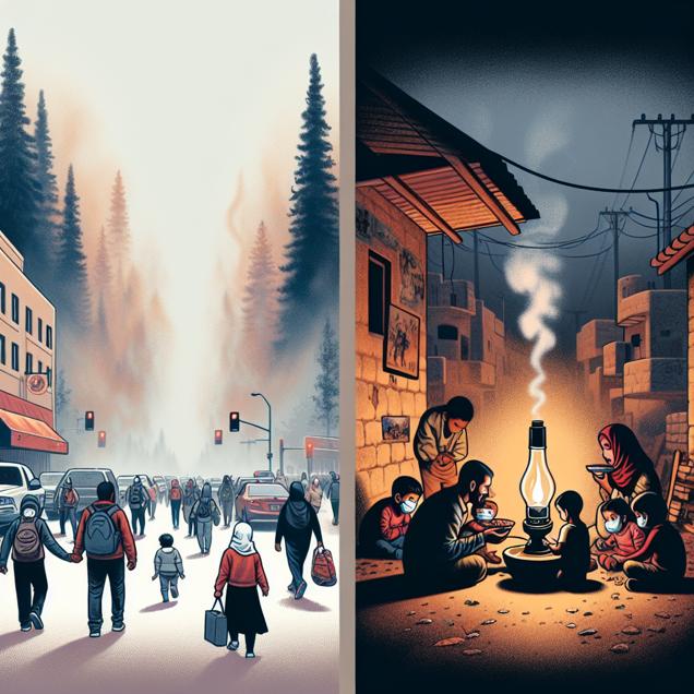 Prompt: Generate a Discovery magazine cover image featuring the contrast between Janesville, Wisconsin and Syria. In Janesville, Wisconsin, thick haze hangs over the city, obscuring the tall trees and people on the streets wearing masks. Simultaneously, in Syria, families gather around a small kerosene lamp, its flickering flame casting a warm glow in the dimly lit room, as they share a meal together. The depiction should include only scenes, people, and objects, it should not include text or speech bubbles.