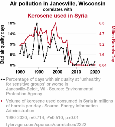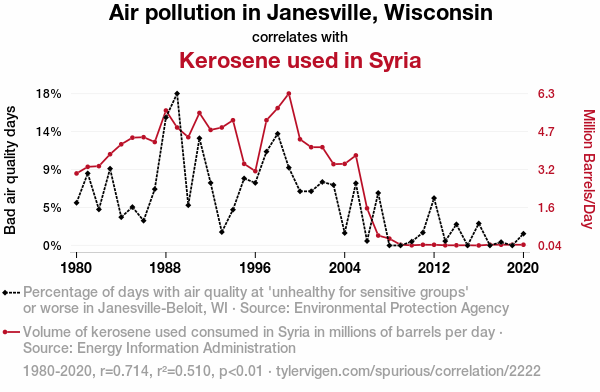 Air pollution, Janesville, Wisconsin, kerosene consumption, Syria, correlation, Environmental Protection Agency data, Energy Information Administration data, correlation coefficient, pollutant-filled skies, research, underlying mechanisms, unexpected association