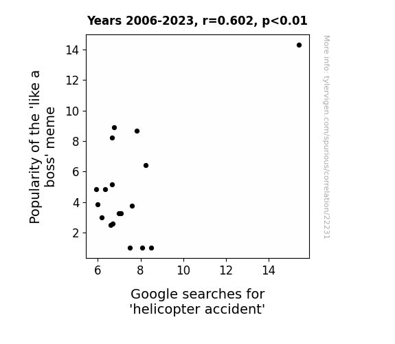 This means 36.3% of the change in the one variable (i.e., Google searches for 'helicopter accident') is predictable based on the change in the other (i.e., Popularity of the 'like a boss' meme) over the 18 years from 2006 through 2023.