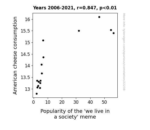 This means 71.7% of the change in the one variable (i.e., Popularity of the 'we live in a society' meme) is predictable based on the change in the other (i.e., American cheese consumption) over the 16 years from 2006 through 2021.