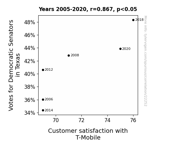This means 75.1% of the change in the one variable (i.e., Customer satisfaction with T-Mobile) is predictable based on the change in the other (i.e., Votes for Democratic Senators in Texas) over the 6 years from 2005 through 2020.