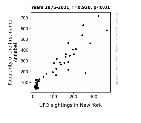 This means 84.7% of the change in the one variable (i.e., UFO sightings in New York) is predictable based on the change in the other (i.e., Popularity of the first name Annabel) over the 47 years from 1975 through 2021.