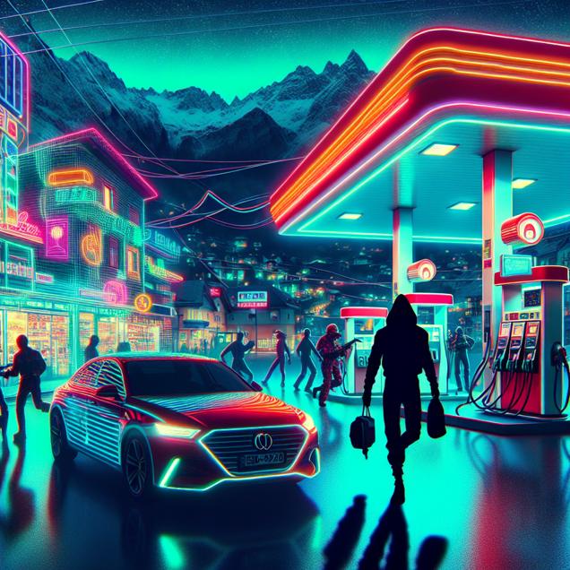 ChatGPT: Generate an image where the gas station in Austria is showcased as a neon-lit hub of activity, with vibrant cyberpunk aesthetics adding a futuristic twist. The thief can be depicted as a shadowy figure, blending seamlessly into the dark and moody environment, while the car and its oblivious driver stand out in stark contrast. The attendants and customers should be bustling with energy, and the scene should be bustling with dynamic cyber enhancements to give it a data cyber art style.