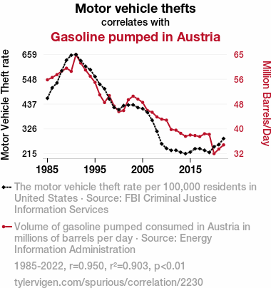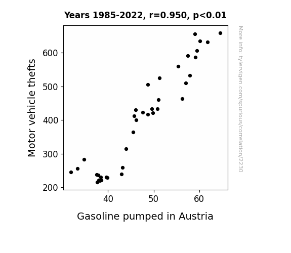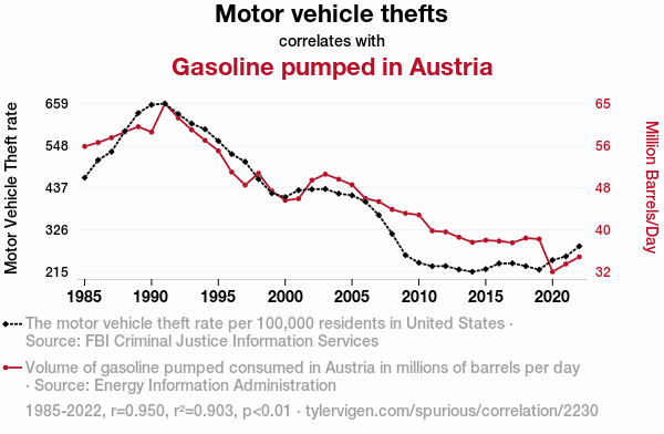 This means 90.3% of the change in the one variable (i.e., Gasoline pumped in Austria) is predictable based on the change in the other (i.e., Motor vehicle thefts) over the 38 years from 1985 through 2022.