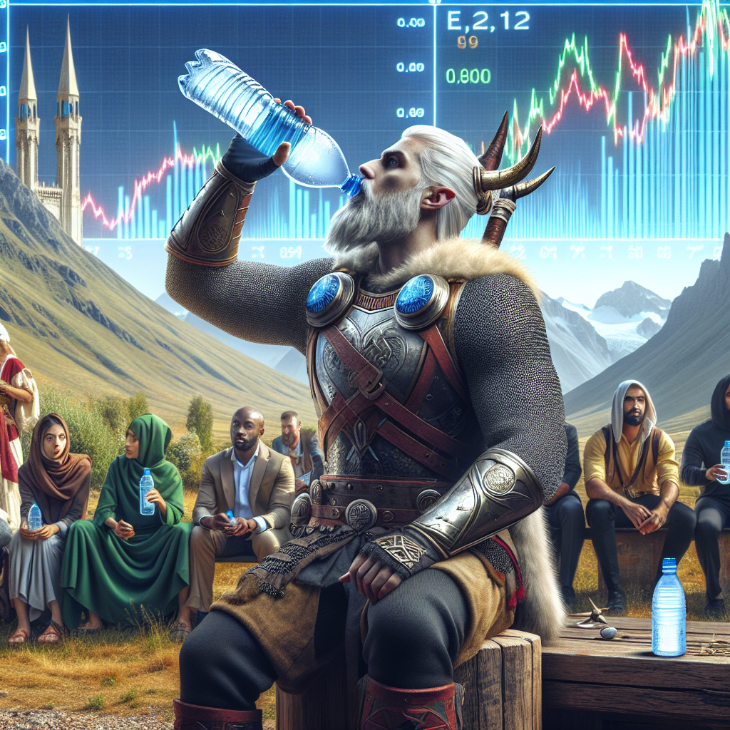 Prompt: Generate an image showing a character in Skyrim enjoying a refreshing drink from a plastic water bottle. The label on the bottle prominently displays the Telkom Indonesia stock price chart. In the background, depict a scene of people in the US carrying similar water bottles. Additionally, show a digital screen displaying the stock market ticker for Telkom Indonesia. The juxtaposition of these elements will create an intriguing and unexpected visual. The depiction should include only scenes, people, and objects, it should not include text or speech bubbles.