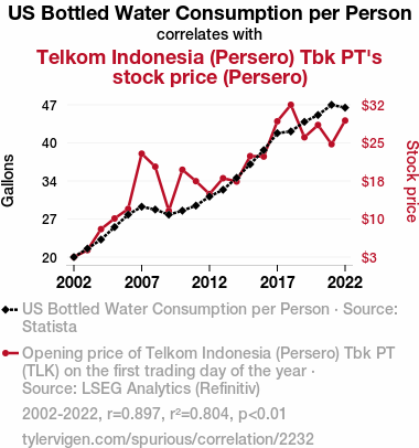 The culmination of our laborious analysis has revealed a remarkable correlation between the per capita consumption of bottled water in the United States and the stock price of Telkom Indonesia (Persero) Tbk PT. The correlation coefficient of 0.8969012 reflects a strong positive relationship between the two variables. This finding suggests that as bottled water consumption in the U.S. ebbed and flowed, so did the stock price of Telkom Indonesia (Persero) Tbk PT, in a synchronized aquatic ballet of market dynamics.