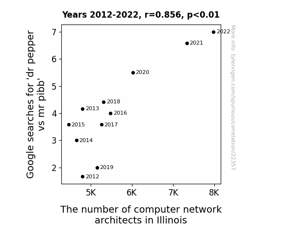 This means 73.3% of the change in the one variable (i.e., The number of computer network architects in Illinois) is predictable based on the change in the other (i.e., Google searches for 'dr pepper vs mr pibb') over the 11 years from 2012 through 2022.
