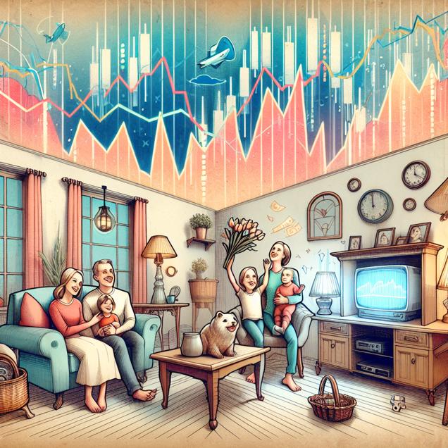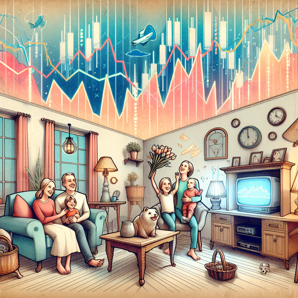 Prompt: [ Whimsical illustration ] A charming living room with chic furniture and sleek appliances. The background hosts a happy family chatting and lounging in the comfort of their home. Overhead, a stock market graph displaying Lennar's soaring stock price creates an intriguing juxtaposition with the homely scene. The depiction should include only scenes, people, and objects, it should not include text or speech bubbles.