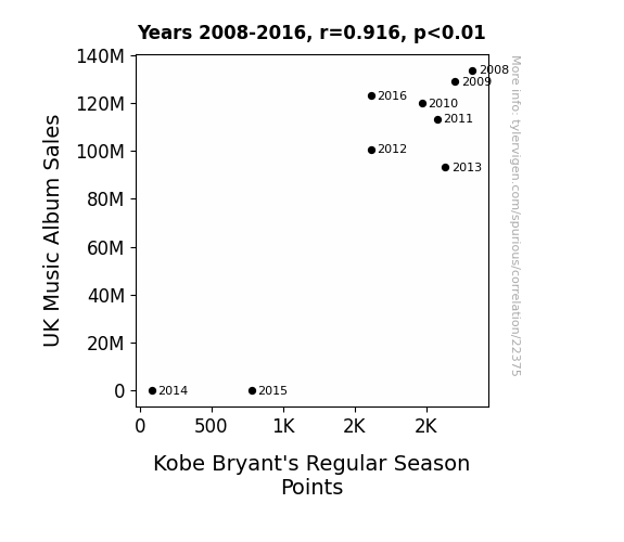 This means 83.9% of the change in the one variable (i.e., Kobe Bryant's Regular Season Points) is predictable based on the change in the other (i.e., UK Music Album Sales) over the 9 years from 2008 through 2016.