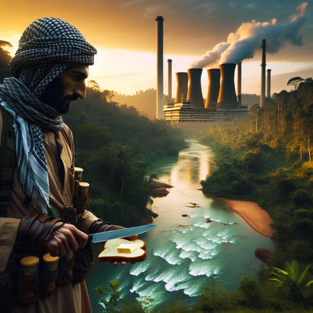 ChatGPT: Prompt: [ A scene from Skyrim ] In the lush forests of Equatorial Guinea, an adventurer is seen standing at the edge of a tranquil river, with the warm, golden glow of the sun illuminating the scenery. Behind the adventurer, a massive power station looms, generating electricity for the nearby village. As the adventurer spreads butter on a slice of freshly baked bread, the contrasting elements of nature and technology in the scene create a captivating juxtaposition. Capture the serenity of the natural landscape and the imposing presence of the power station while highlighting the simple act of spreading butter on bread.