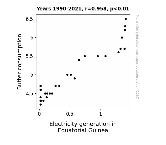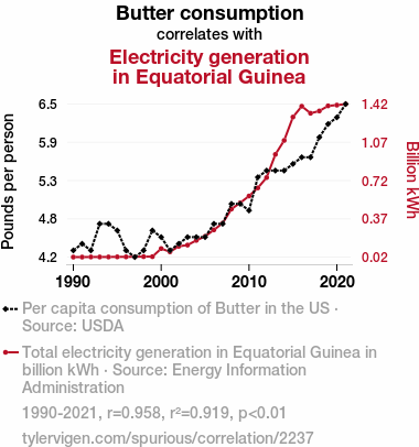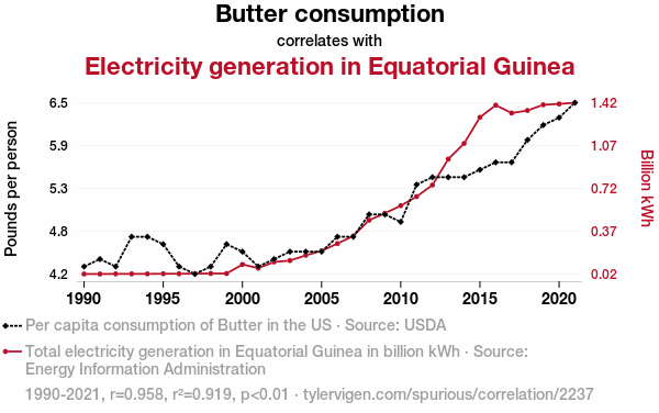 - The spurious research paper: Churning Out Power: Exploring the Relationship Between Butter Consumption and Electricity Generation in Equatorial Guinea