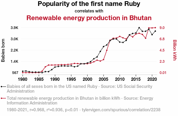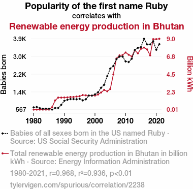 - The spurious research paper: Ruby's Renowned Role: Exploring the Correlation Between the Popularity of the Name Ruby and Renewable Energy Production in Bhutan