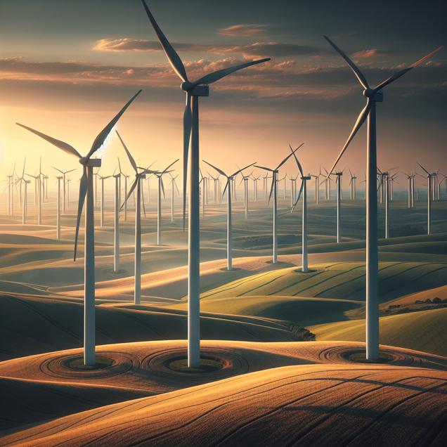 Prompt: [ A photo-realistic image ] Create an expansive landscape dominated by tall, majestic wind turbines, each one rotating gracefully in the strong breeze. The fields stretch out into the distance, with the turbines standing proudly against the horizon. The setting sun casts a warm glow over the landscape, highlighting the intricate details of each turbine blade and the surrounding fields. The scene exudes a sense of tranquility and power, with a subtle but palpable energy coursing through the air. The turbines seem to come alive, their motion synchronized as if responding to an unseen force. The image should capture the harmonious fusion of natural wind power and the intangible energy evoked by the rising Eleanors, creating a mesmerizing visual representation of sustainable energy in motion. The depiction should include only scenes, people, and objects, it should not include text or speech bubbles.