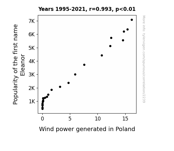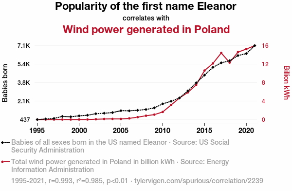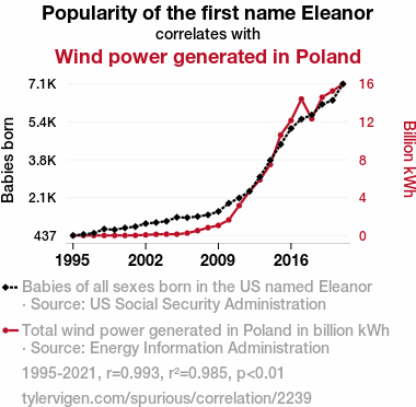 - The spurious research paper: Blowin' in the Eleanor: Investigating the Relationship Between the Popularity of the Name Eleanor and Wind Power Generation in Poland
