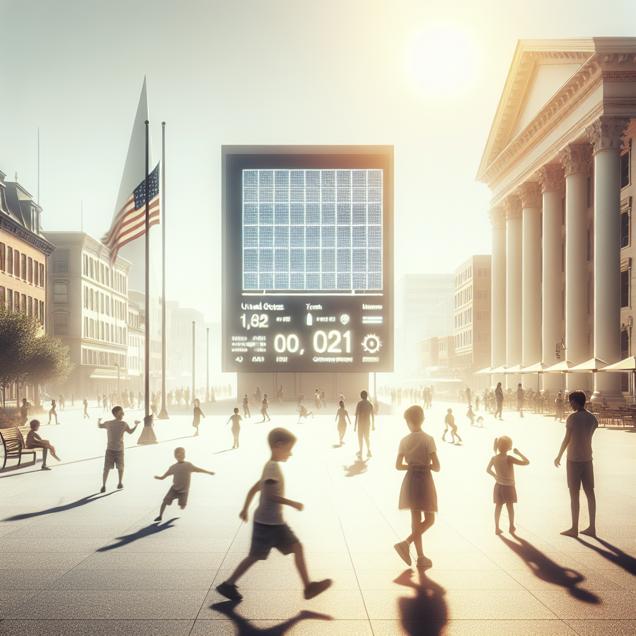 ChatGPT: Prompt: In a minimalist style, generate an image of a bustling United States town square on a bright and sunny day. In the center of the square, a large digital display proudly shows the real-time solar power generation. Children are playing nearby, and a little boy named Maverick is surrounded by friends. Create a simple, clean and visually striking representation of this scene.