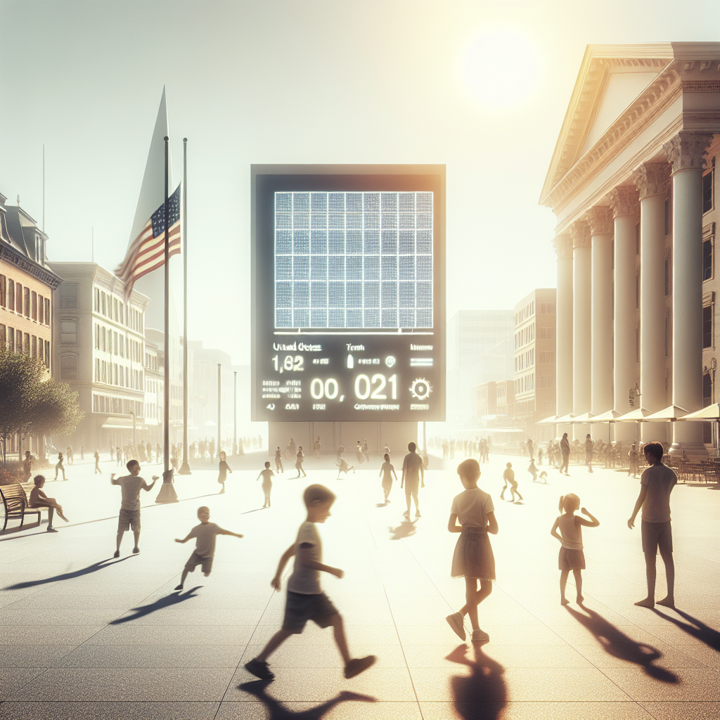 Prompt: Prompt: In a minimalist style, generate an image of a bustling United States town square on a bright and sunny day. In the center of the square, a large digital display proudly shows the real-time solar power generation. Children are playing nearby, and a little boy named Maverick is surrounded by friends. Create a simple, clean and visually striking representation of this scene. The depiction should include only scenes, people, and objects, it should not include text or speech bubbles.