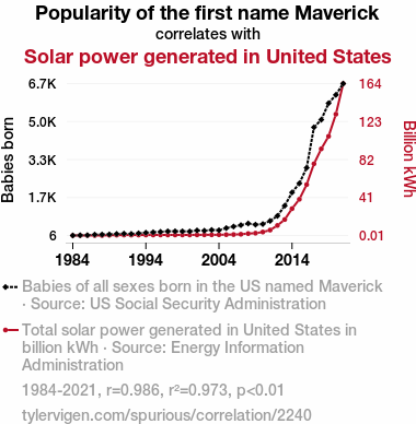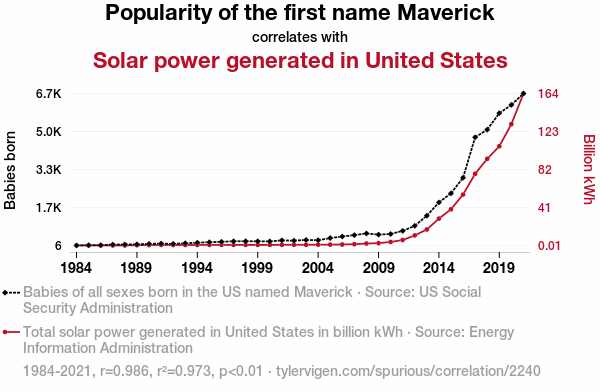 We've all heard the phrase "as rare as a solar eclipse," but it seems that "Maverick" might just give solar energy a run for its money in the rarity department. Our data revealed a strikingly strong association between the popularity of the name "Maverick" and the amount of solar power generated in the United States over the past few decades. It's almost as if every time a baby is named Maverick, a solar panel somewhere catches a little extra sunlight.