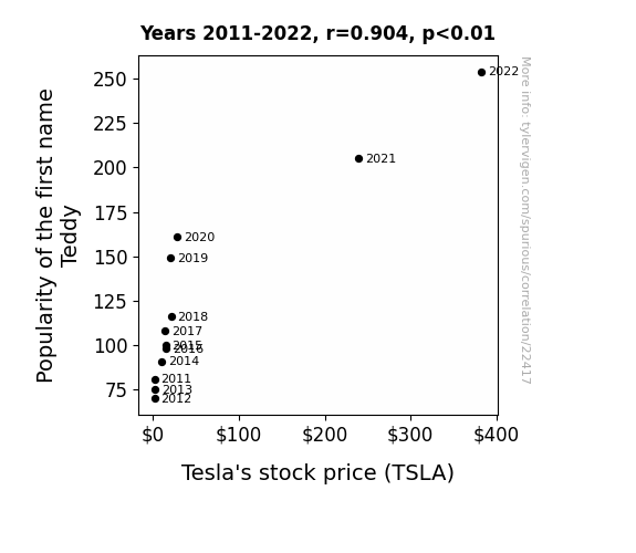 This means 81.7% of the change in the one variable (i.e., Tesla's stock price (TSLA)) is predictable based on the change in the other (i.e., Popularity of the first name Teddy) over the 12 years from 2011 through 2022.