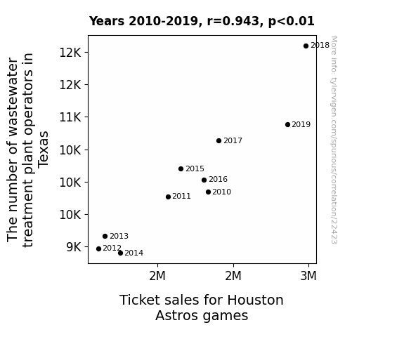 This means 89% of the change in the one variable (i.e., Ticket sales for Houston Astros games) is predictable based on the change in the other (i.e., The number of wastewater treatment plant operators in Texas) over the 10 years from 2010 through 2019.
