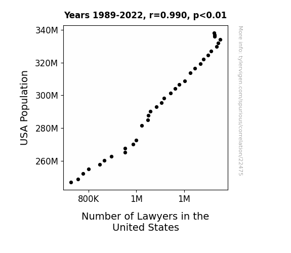 This means 98.1% of the change in the one variable (i.e., Number of Lawyers in the United States) is predictable based on the change in the other (i.e., USA Population) over the 34 years from 1989 through 2022.