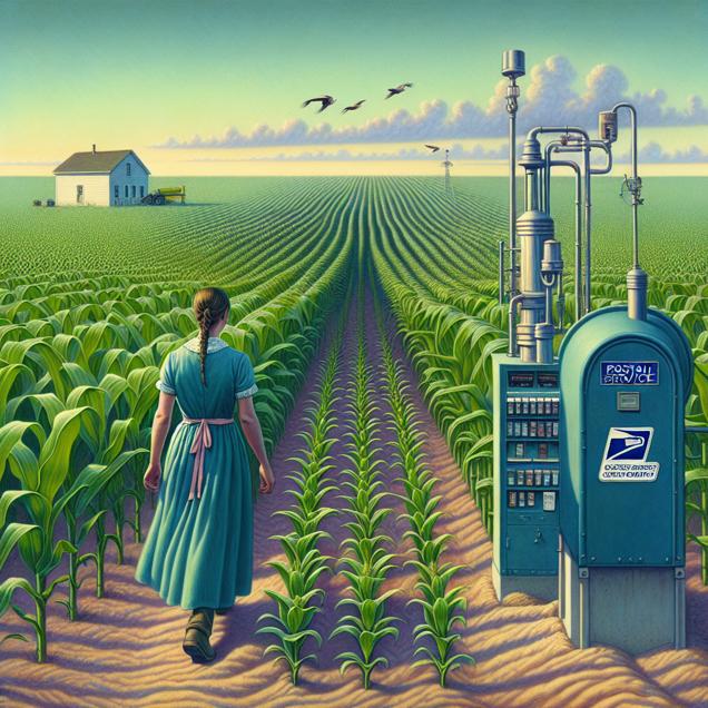 ChatGPT: In a vast cornfield in Nebraska, a farmer walks through rows of genetically modified corn. In the distance, a small post office is run by just a few postal service machine operators, handling the mail for the community.
