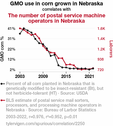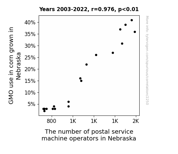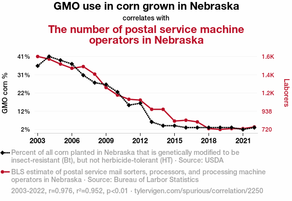 - The spurious research paper: A-Maize-ing Connections: Exploring the Relationship Between GMO Corn and Postal Service Machine Operators in Nebraska