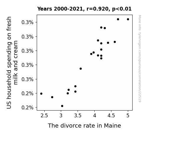 This means 84.7% of the change in the one variable (i.e., The divorce rate in Maine) is predictable based on the change in the other (i.e., US household spending on fresh milk and cream) over the 22 years from 2000 through 2021.