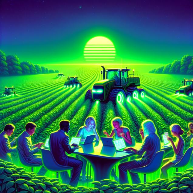 ChatGPT: Generate an image of a surreal landscape featuring a vibrant green soybean field in Wisconsin. The soybean plants exude a luminescent, almost otherworldly glow, giving the scene a dreamlike quality. Advanced farming machinery can be seen working efficiently across the fields, surrounded by shimmering halos of neon light. In the background, a group of people sits around a sleek, modern table, their faces illuminated by the soft glow of their laptops' screens. Their laughter and animated expressions suggest an air of lightheartedness and camaraderie as they browse the internet, their searches and conversations interwoven with the whimsical, nostalgic aesthetic of vaporwave culture.