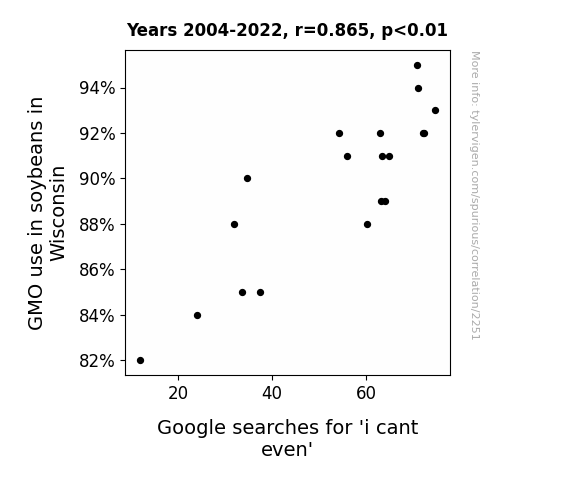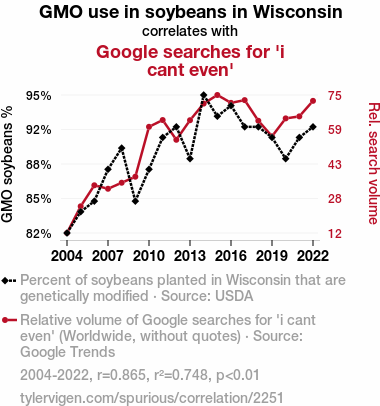 - The spurious research paper: Genetically Modified Soybeans in Wisconsin and the Goofy Google Search for 'I Can't Even': A Gleeful Glimpse into Correlation