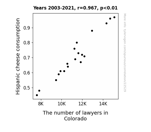 This means 93.6% of the change in the one variable (i.e., The number of lawyers in Colorado) is predictable based on the change in the other (i.e., Hispanic cheese consumption) over the 19 years from 2003 through 2021.