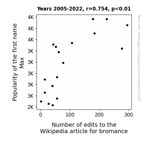 See what else correlates with Number of edits to the Wikipedia article for bromance