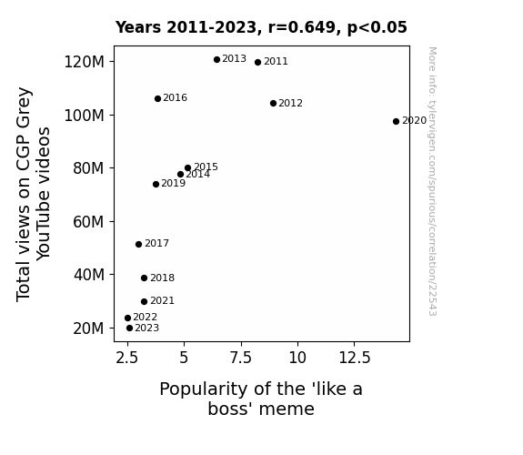 This means 42.2% of the change in the one variable (i.e., Popularity of the 'like a boss' meme) is predictable based on the change in the other (i.e., Total views on CGP Grey YouTube videos) over the 13 years from 2011 through 2023.