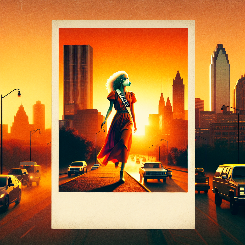 ChatGPT: Create an image with the style of a Polaroid photo, depicting downtown Fargo at sunset. The city is bathed in an orange hue from the setting sun, with buildings silhouetted against the sky. On the sidewalk, Miss America, 28 years old, walks briskly while wearing a mask to shield herself from the polluted air. The scene captures the atmosphere of a city struggling with environmental challenges but also the determination of its people to persevere.