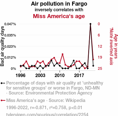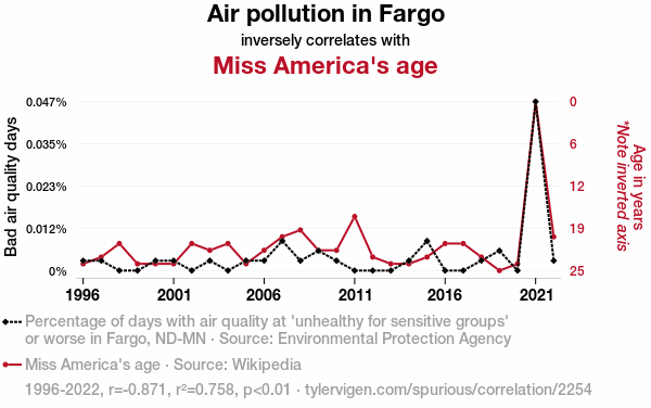 A linear line chart with years as the X-axis and two variables on the Y-axis. The first variable is Air pollution in Fargo and the second variable is Miss America's age.  The chart goes from 1996 to 2022, and the two variables track closely in value over that time. Small Image