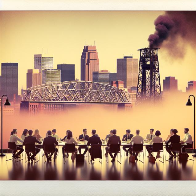 ChatGPT: Duluth's skyline is shrouded in a hazy smog, with the iconic Aerial Lift Bridge barely visible through the polluted air. Meanwhile, a crowded room of real estate brokers in Minnesota is bustling with activity, with eager professionals discussing and showcasing available properties to potential buyers.