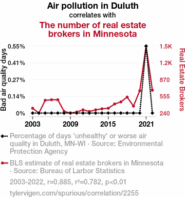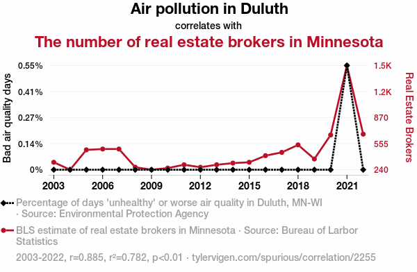 This means 78.2% of the change in the one variable (i.e., The number of real estate brokers in Minnesota) is predictable based on the change in the other (i.e., Air pollution in Duluth) over the 20 years from 2003 through 2022.