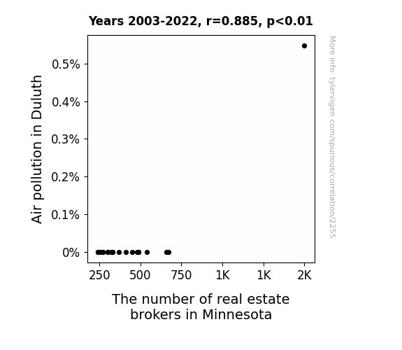 This study explores the relationship between air pollution levels in Duluth, Minnesota, and the number of real estate brokers in the state. Using data collected from the Environmental Protection Agency and the Bureau of Labor Statistics for the period 2003 to 2022, a correlation coefficient of 0.8845140 and p-value less than 0.01 was calculated, indicating a strong positive association between air pollution and the real estate broker population. The findings suggest that as air pollution levels rise in Duluth, so does the number of real estate brokers in Minnesota. This unexpected correlation raises intriguing questions about the psychological and economic implications of environmental factors on occupational choices. It seems that for real estate brokers, "where there's smog, there's fog of real estate"!