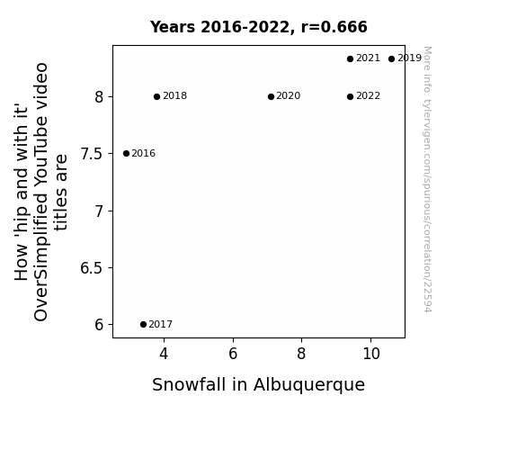 This means 44.4% of the change in the one variable (i.e., Snowfall in Albuquerque) is predictable based on the change in the other (i.e., How 'hip and with it' OverSimplified YouTube video titles are) over the 7 years from 2016 through 2022.